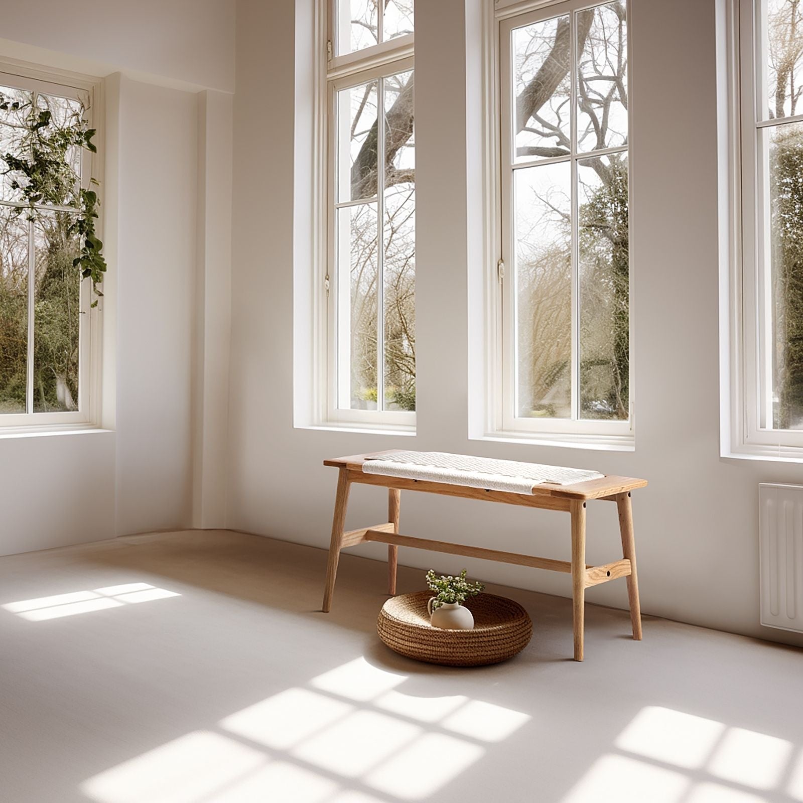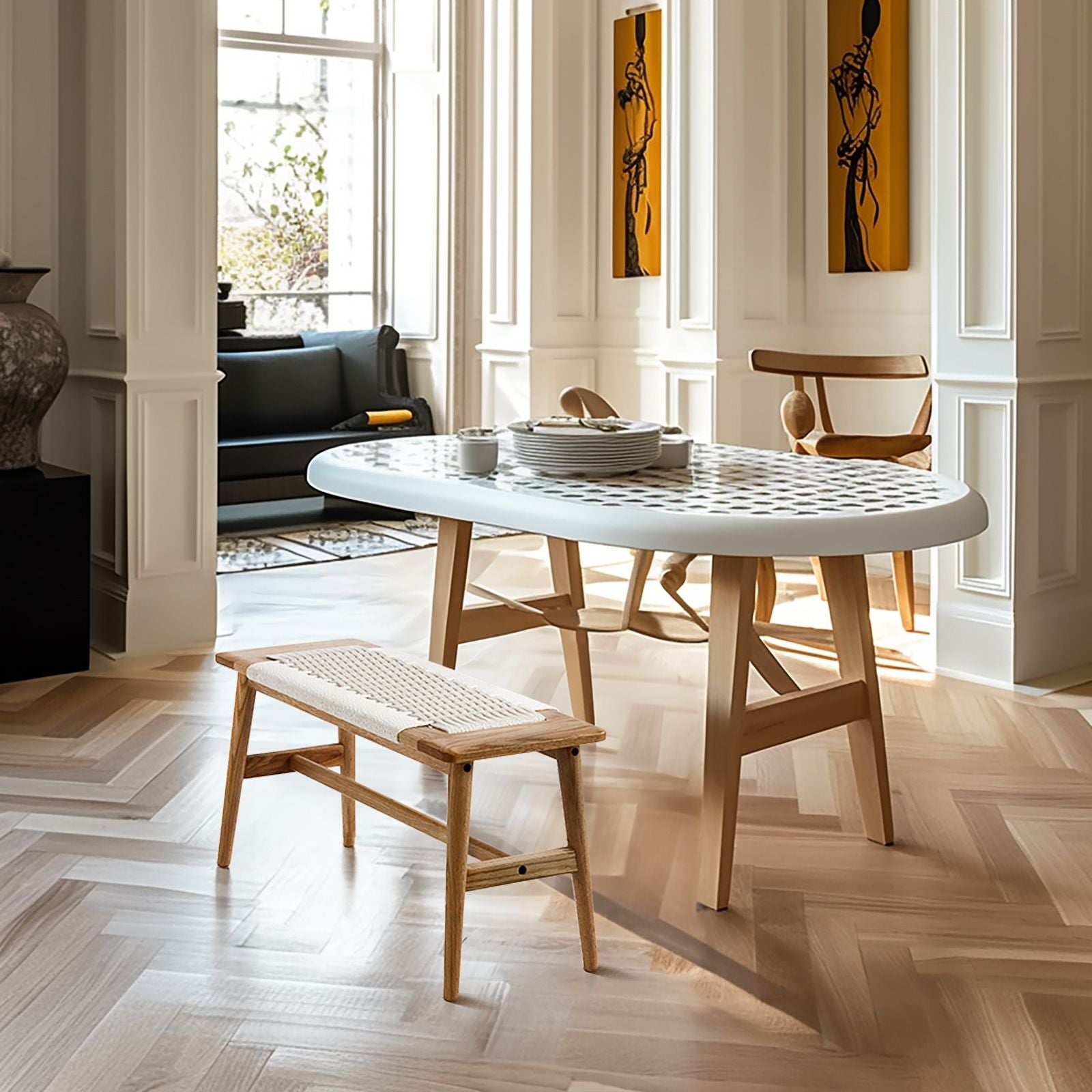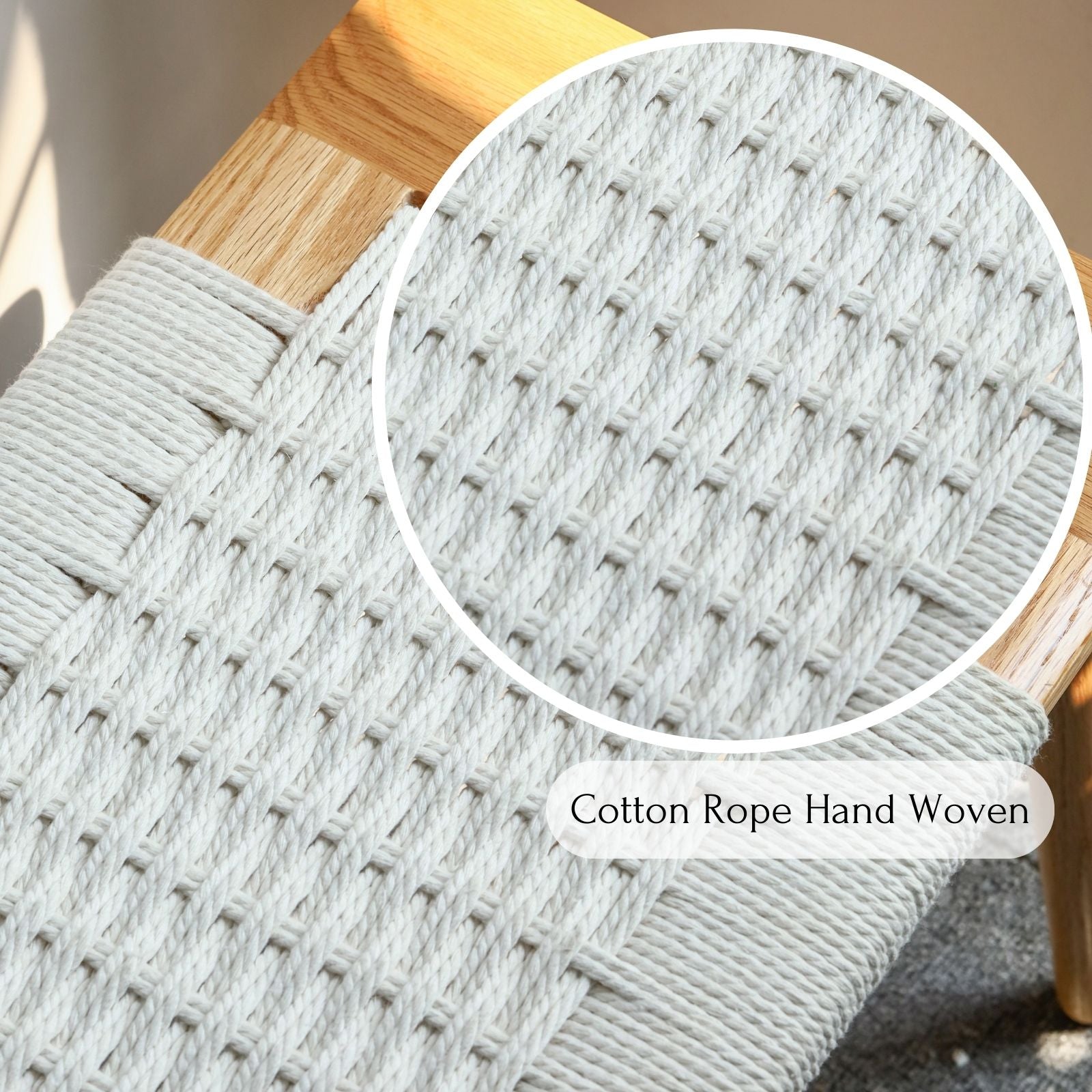 100% Solid Oak Wood Bench Hand Woven Bench (Off-White / Natural)